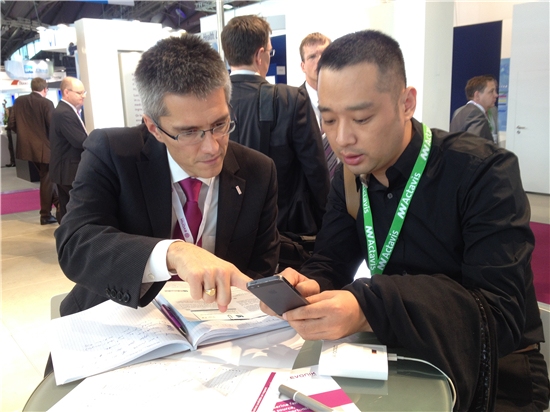 圖為姜曉東副總裁與贏創(chuàng)美詩(shī)工業(yè)生產(chǎn)線負(fù)責(zé)人菲利普博士洽談