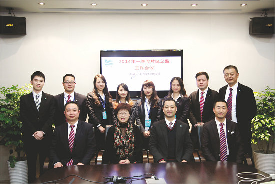 圖為2014年一季度片區(qū)總監(jiān)會(huì)議合影(前左二為陶靈萍董事長(zhǎng),前右二為姜曉東副總裁)