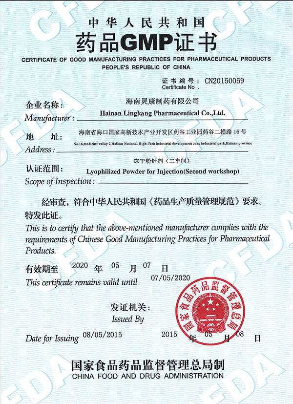 2 0 1 5 年5 月8 日, 國家食品藥品監(jiān)督管理總局發(fā)文:根據(jù)《中華人民共和國藥品管理法》及有關(guān)規(guī)定,經(jīng)國家食品藥品監(jiān)督管理總局食品藥品審核查驗中心現(xiàn)場檢查、技術(shù)審核,海南靈康制藥有限公司符合《藥品生產(chǎn)質(zhì)量管理規(guī)范( 2 0 1 0 年修訂) 》要求。海南靈康制藥有限公司正式收到國家食品藥品監(jiān)督管理總局頒發(fā)的《藥品G M P 證書》。由海南省食品藥品監(jiān)督管理局指定日常監(jiān)管機構(gòu)及監(jiān)管人員, 并向社會公布, 同時報國家食品藥品監(jiān)督管理總局備案。這是海南靈康制藥有限公司繼2 0 1 4 年9 月3 0 日無菌原料藥車間順利通過新版G M P 認證后, 又一次順利通過G M P 認證。