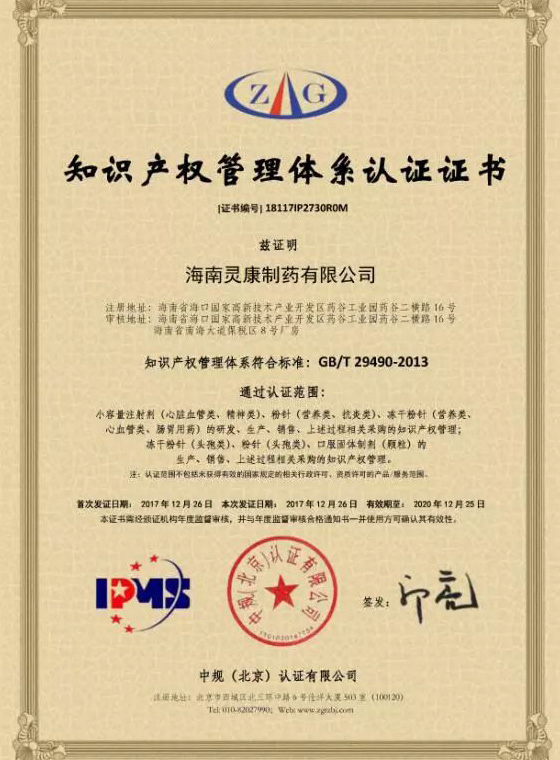靈康藥業(yè)集團(tuán)海南靈康制藥有限公司榮獲《知識(shí)產(chǎn)權(quán)管理體系認(rèn)證證書》