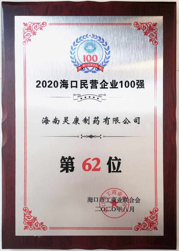 海南靈康制藥有限公司榮獲“2020年海口市民營企業(yè)100強”稱號