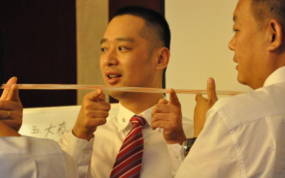 培訓(xùn)課程中還穿插了很多互動(dòng)游戲,其中有一個(gè)是“齊眉棍”,這個(gè)活動(dòng)很簡單,將全體人員分成若干小組,每個(gè)小組配一根齊眉棍,然后每位小組成員雙手做成手槍式,將齊眉棍水平的放在每位成員的食指上,然后慢慢水平下移到地面上,期間不能讓棍子不離開任何一位成員的手指??此坪芎唵蔚囊粋€(gè)小游戲,但是卻反饋出了很大的哲理。從宏觀的來看,這個(gè)游戲代表的便是整個(gè)社會(huì),人人都有自己的工作、有自己的職責(zé),任何人都缺一不可;從微觀來看,這就體現(xiàn)出了團(tuán)隊(duì)協(xié)作的重要,在整個(gè)活動(dòng)中,任何一個(gè)組員的不配合、不協(xié)調(diào)、不統(tǒng)一,就會(huì)影響到全局,影響的最后的結(jié)果?;顒?dòng)剛開始的時(shí)候組員的凝聚力并不強(qiáng),大家都從自己的角度來考慮,沒有統(tǒng)一的思想,沒有統(tǒng)一的命令,別說放下棒了,即使想向下移動(dòng)一點(diǎn)也是很困難的。最后還是吳老師的點(diǎn)撥,讓大家很快找到了竅門。每組都對組員進(jìn)行了分工,把口令的發(fā)布權(quán)統(tǒng)一到了指定一個(gè)人的手中,大家按照口令逐步統(tǒng)一協(xié)調(diào)下移,很快就完成了游戲。